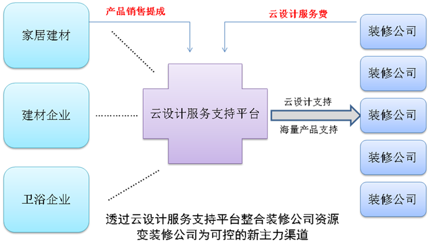 依托云設(shè)計(jì)服務(wù)支持,包括各經(jīng)銷商、賣場、裝修公司等都可以通過設(shè)計(jì)平臺(tái)快速設(shè)計(jì),并擁有眾多企業(yè)提供的海量產(chǎn)品,如果云設(shè)計(jì)服務(wù)支持平臺(tái)能解決合作粘性問題,確保平臺(tái)加盟企業(yè)提供的產(chǎn)品的品質(zhì)和質(zhì)量,裝修公司將擁有比一般經(jīng)銷商和賣場更好的優(yōu)勢(shì),家居企業(yè)企業(yè)透過云設(shè)計(jì)服務(wù)支持平臺(tái),最終有望和全國十多萬在冊(cè)裝修設(shè)計(jì)公司合作,又不需要設(shè)置龐大營銷部門。家居企業(yè)在各地的專門店、展廳可以成為裝修公司的上游服務(wù)機(jī)構(gòu),也可以由家居企業(yè)單獨(dú)設(shè)置合作對(duì)接部門,對(duì)產(chǎn)品供應(yīng)品系、價(jià)格予單獨(dú)管理,其權(quán)重和利益分配由企業(yè)具體掌控。