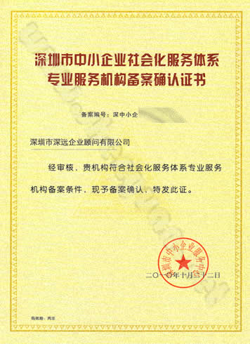 近日,經深圳市中小企業(yè)服務中心驗證審查,符合相關規(guī)定的資質要求,深圳市深遠企業(yè)顧問有限公司取得了深圳市中小企業(yè)社會化服務體系專業(yè)服務機構備案認可。